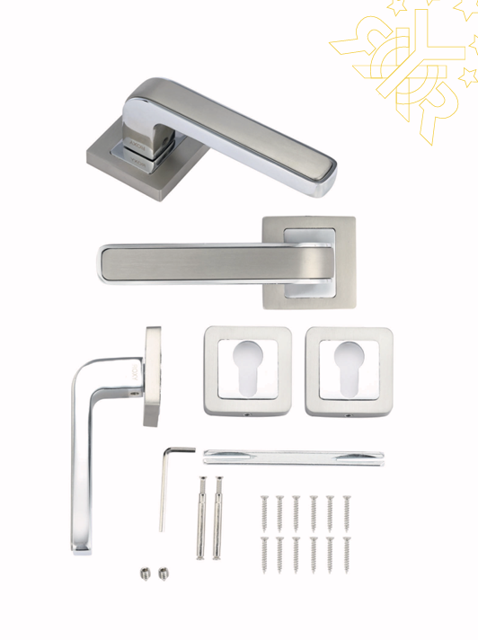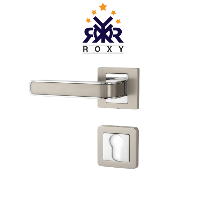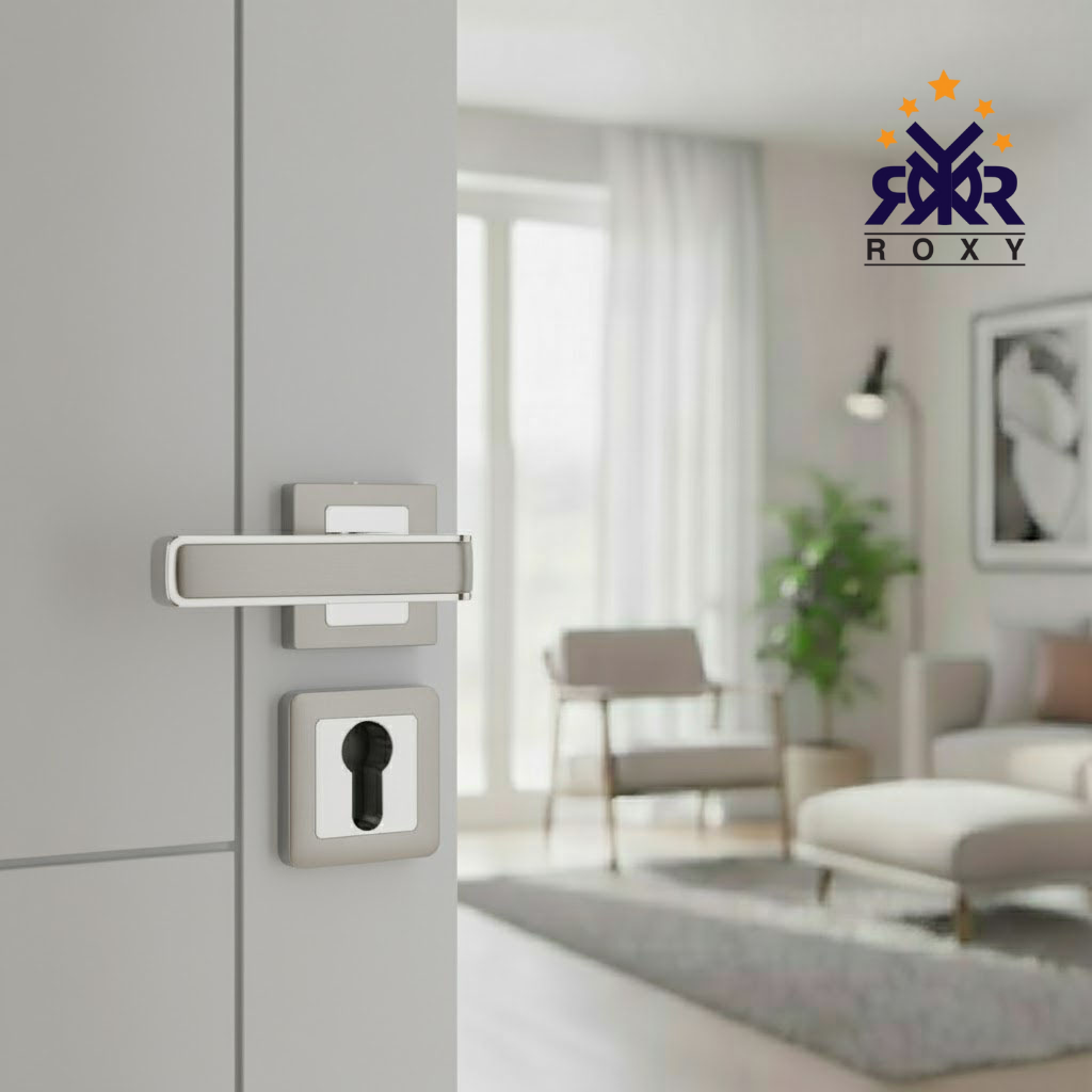 مسكة باب فاخرة باللون الفضي ا مزوّد بلمسة كروم لامعة تضيف فخامة وأناقة عصرية. تصميمه المستطيل الأنيق يجمع بين القوة والجمال، ليكمّل ديكور الأبواب الداخلية بطابع راقٍ ومتناسق.